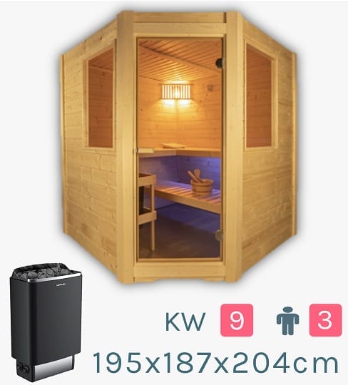 ■ 40 mm Spruce ■ Limewood Interior ■ 9 kW Stove ■ Manual Controls ■ Granite Stones ■ Kit Form Assembly ■ Internal Light ■ Volume: 8.6 m3 ■ Floor Grid: 700 x 530 x 40mm |