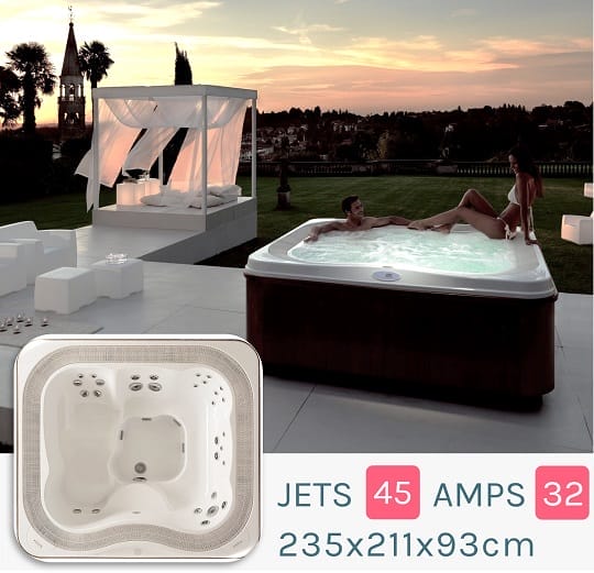 The LED lighting system helps to produce more light per watt than incandescent bulbs and last longer and cost less than other types of bulbs. The lighting enhances both the look of the hot tub and the regenerating effect of the water with an infinite combination of colours.