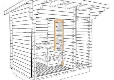 The Sentiotec™ Lava outdoor sauna cabin structure comprises of 70mm spruce, while the internal sauna is finished in smooth limewood. The unit comes with a double-glazed fixed window and a lockable external door. This allows access to the internal lobby changing room. The large overhang roof gives shelter to the front access. The internal sauna seats 4-5 people, with two wide benches.