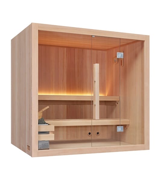 ■ Canadian Hemlock ■ Limewood Interior ■ 8 kW Harvia Stove ■ Digital Controls ■ Granite Stones ■ Kit Form Assembly ■ LED Colour Light ■ LED Remote Control |