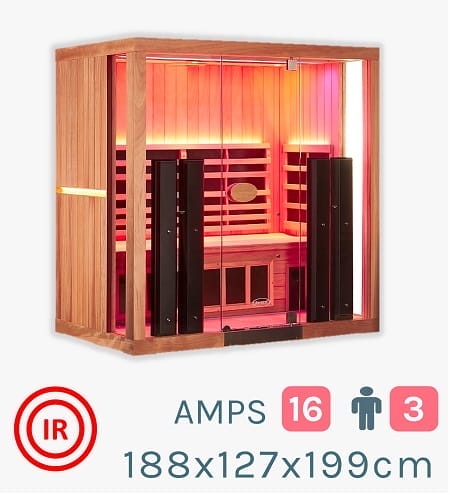 ■ Canadian Hemlock ■ 8kW Harvia Stove & Stones ■ Digital Controls ■ 4300W: Far-Infrared Panels ■ Kit Form Assembly ■ LED Colour Light & Remote ■ I.R. Range: 49°C-65°C ■ Stove Range 65°C-90°C |