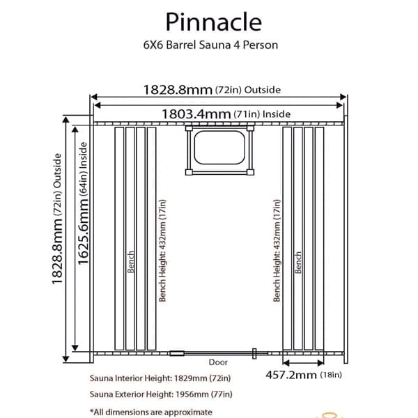 "Tried and true, the Pinnacle is both a staple and a best-seller. Measuring 6’x6’, this barrel sauna embodies a “happy medium” to a T: not too small and not too big. You can stretch out on your own or invite three friends to experience the magic of the sauna. Paired with a 6kW electric heater, you’ll be sweating in less than an hour as the temperatures climb to 90ºC. Instant relaxation is right around the corner with a Pinnacle Barrel sauna!"